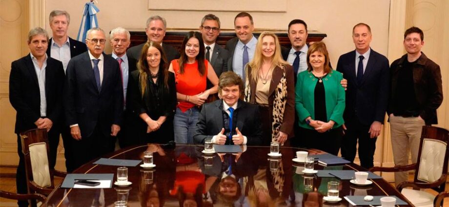 También participaron Karina Milei, secretaria general de la Presidencia; María Ibarzabal Murphy, secretaria Legal y Técnica; Martín Menem, titular de la Cámara de Diputados; Santiago Bausili, presidente del Banco Central; y el asesor presidencial Santiago Caputo, quien fue el único que evitó posar ante las cámaras oficiales.